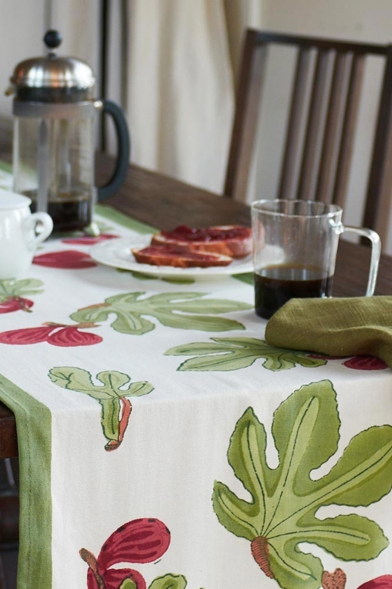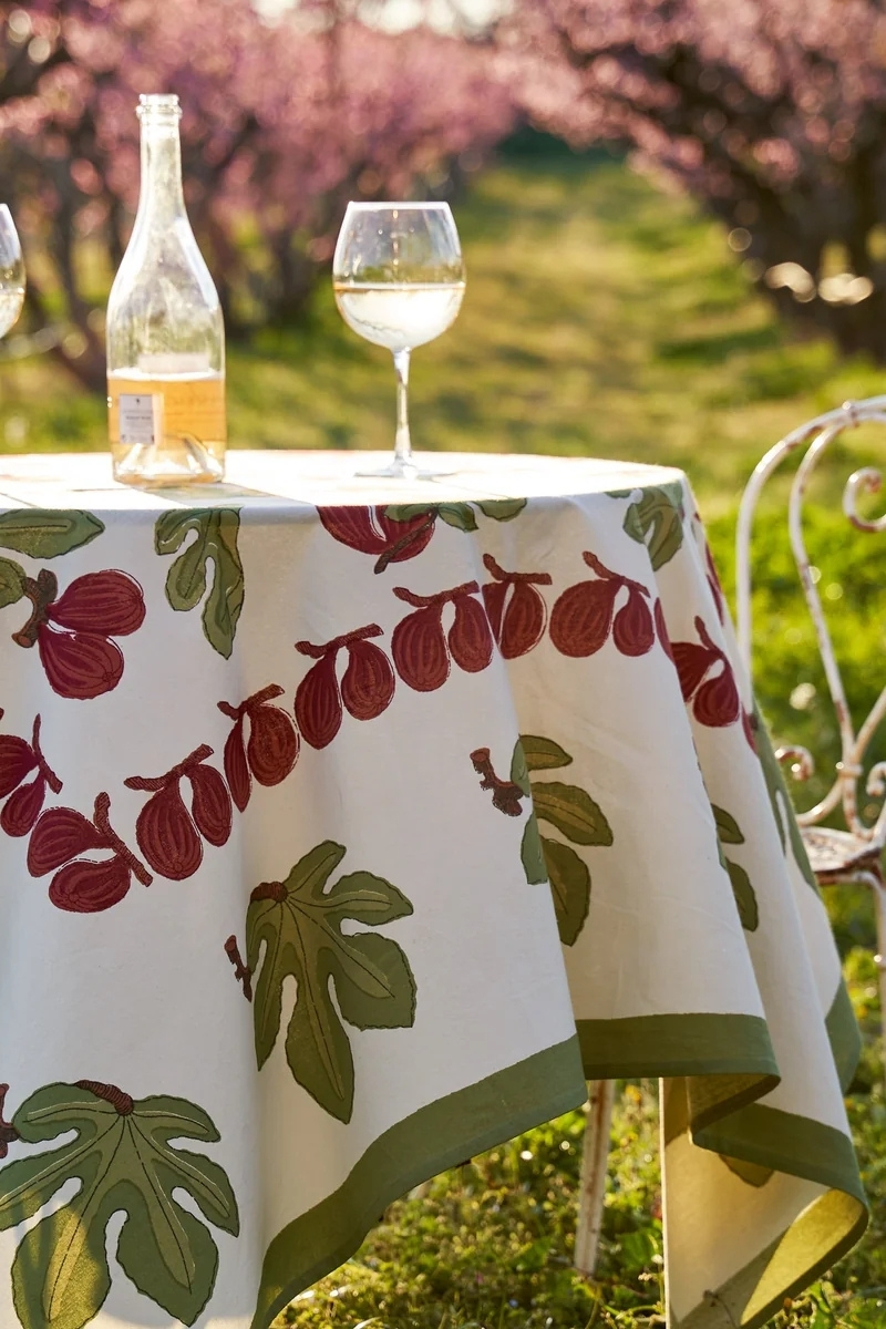The Figue Rouge collection adds character to your table: handmade tablecloth, napkins, table runner, placemats, tea towel, apron, bag and sarong — each piece hand-printed in India, unique by nature.