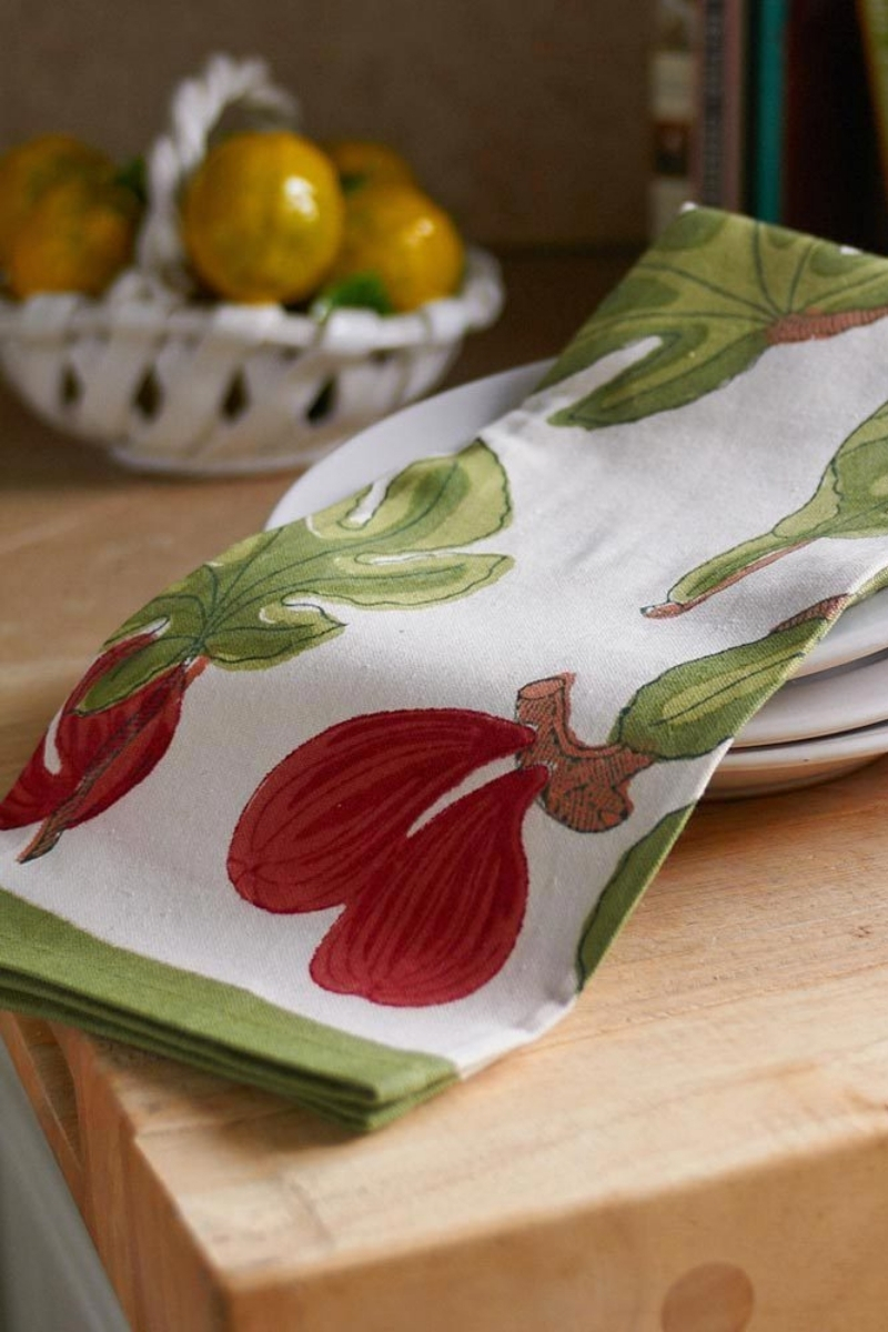 Plump figs and green leaves hand-printed on white cotton, using the traditional block-printing technique (handcrafted printing with wooden blocks). A warm and inviting design by Bruno Lamy.