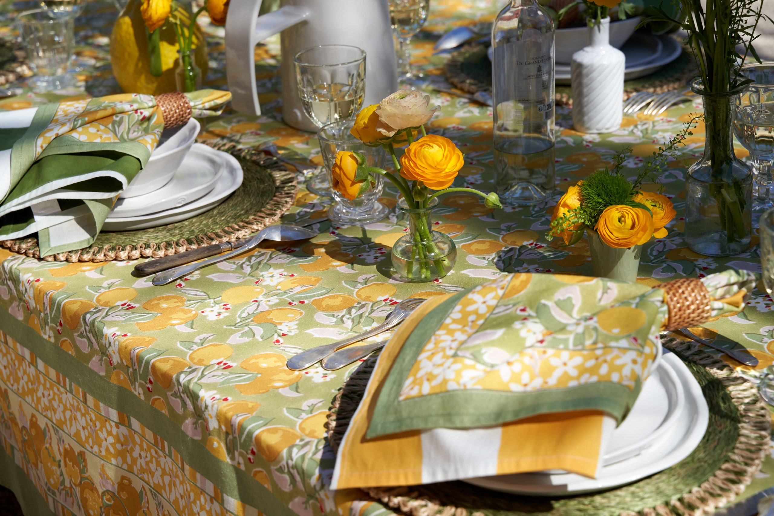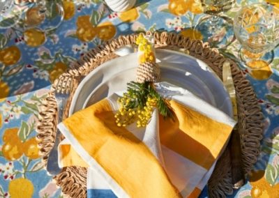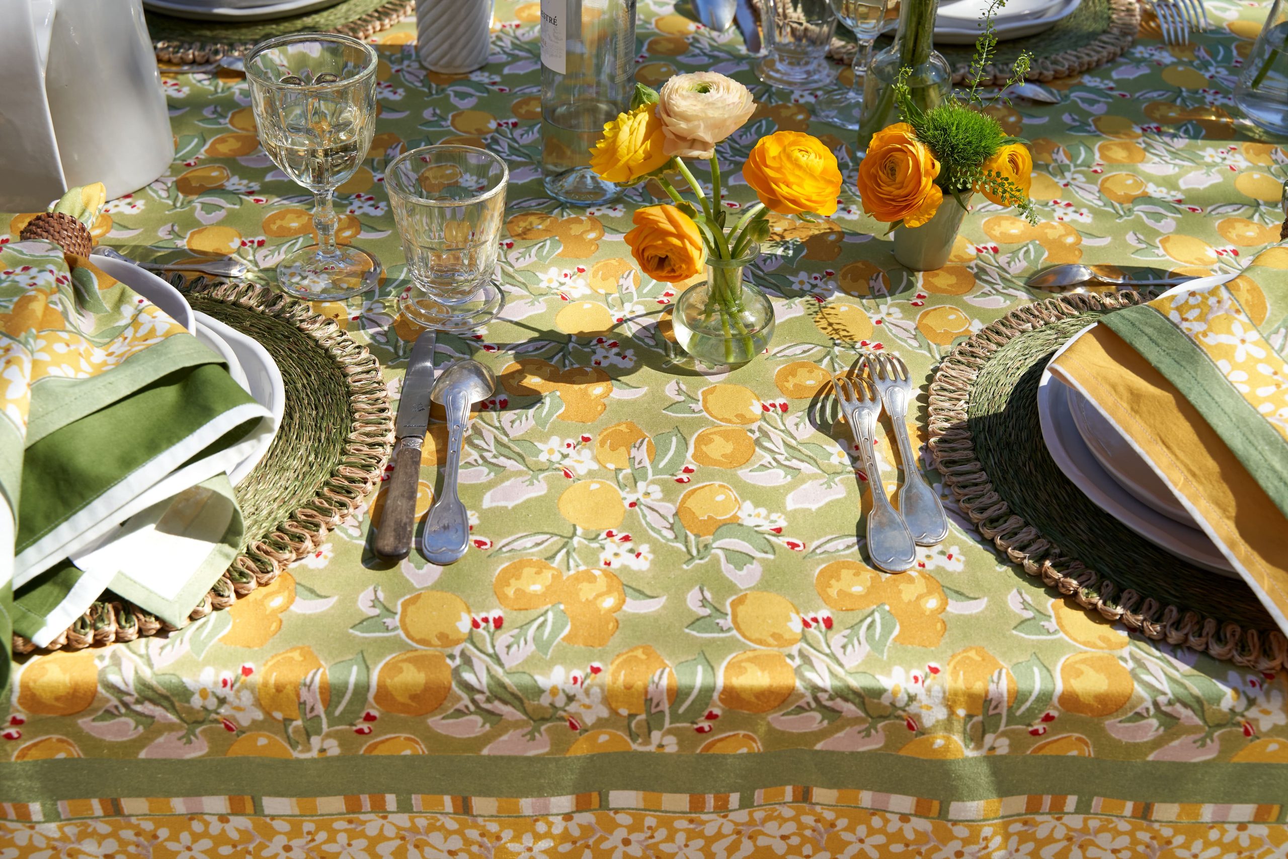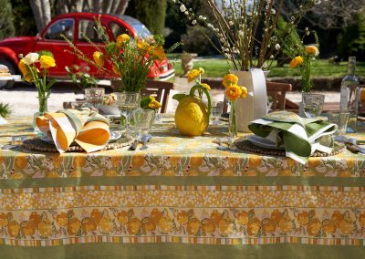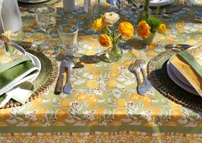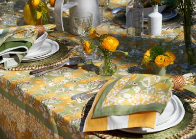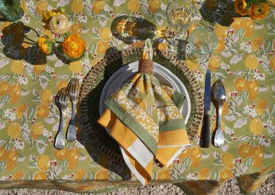 Un fond vert tendre, solaire, végétal — l’impression d’être au cœur d’un verger de citronniers. La collection Citron Vert habille la table au quotidien comme pour les grandes occasions : nappes, serviettes, chemins de table, sets de table, tabliers, torchons.