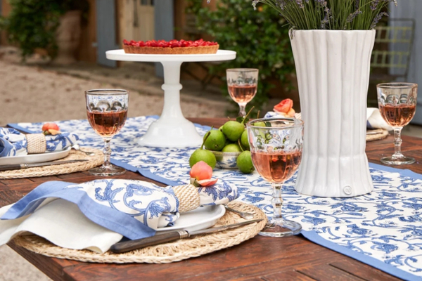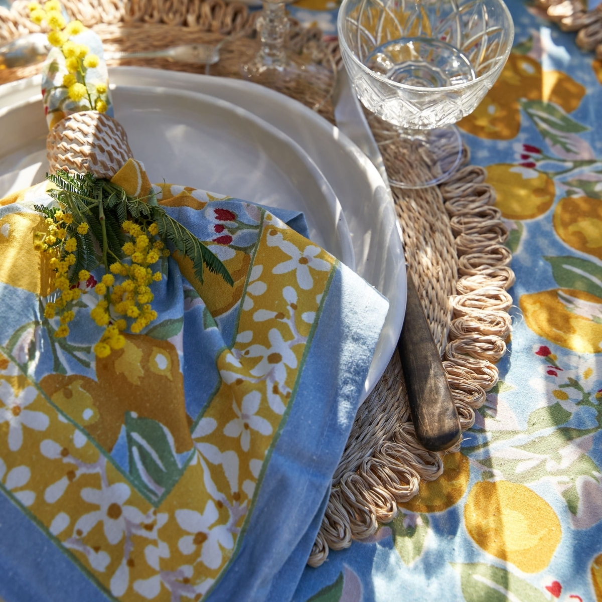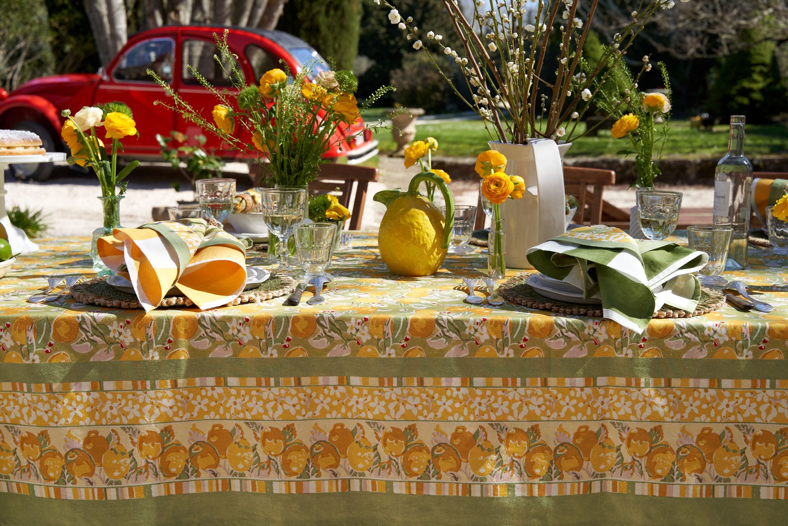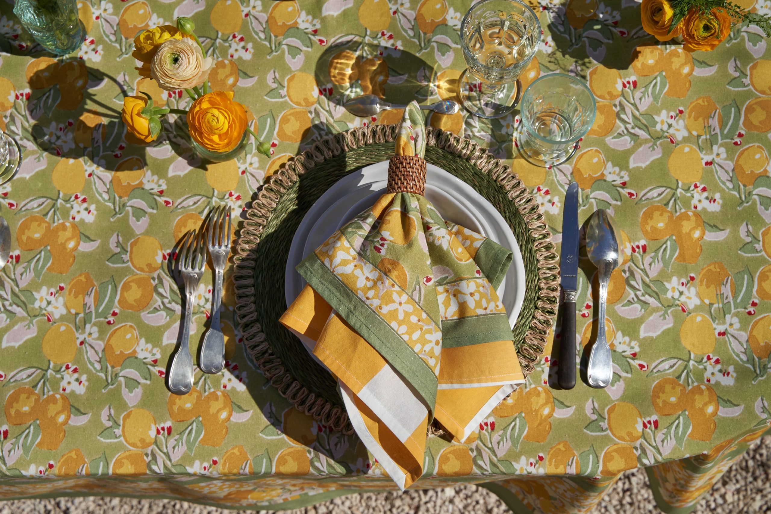 Un fond vert tendre, solaire, végétal — l’impression d’être au cœur d’un verger de citronniers. La collection Citron Vert habille la table au quotidien comme pour les grandes occasions : nappes, serviettes, chemins de table, sets de table, tabliers, torchons.