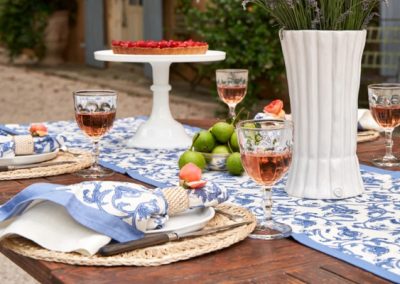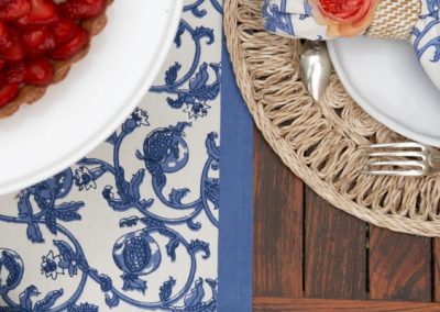 Un fond bleu lumineux et original, frais, apportant une touche pop au cœur de la maison ! La collection Citron Bleu habille la table au quotidien comme pour les grandes occasions : nappes, serviettes, chemins de table, sets de table, tabliers, torchons.