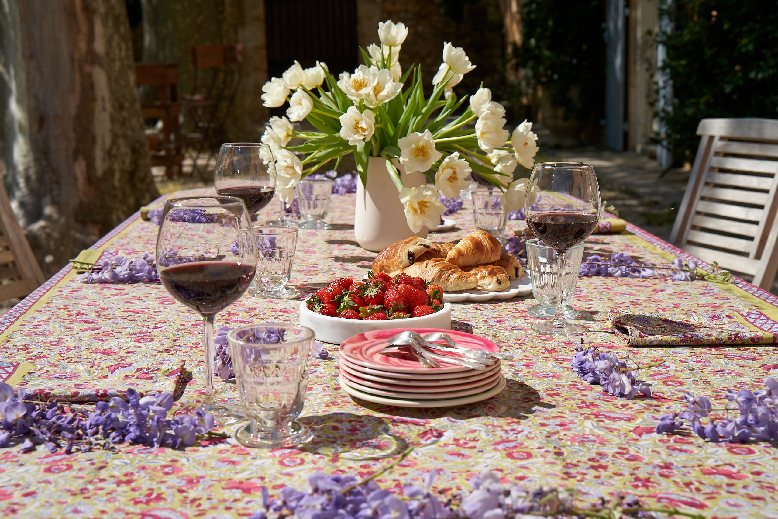 Nos collections sont pensées pour allier esthétisme, douceur et qualité. Chaque pièce, qu’il s’agisse de nos emblématiques nappes fleuries, de nos serviettes en coton ou de nos sets de table, est conçue avec soin pour apporter une touche d’élégance et d’authenticité à votre intérieur.